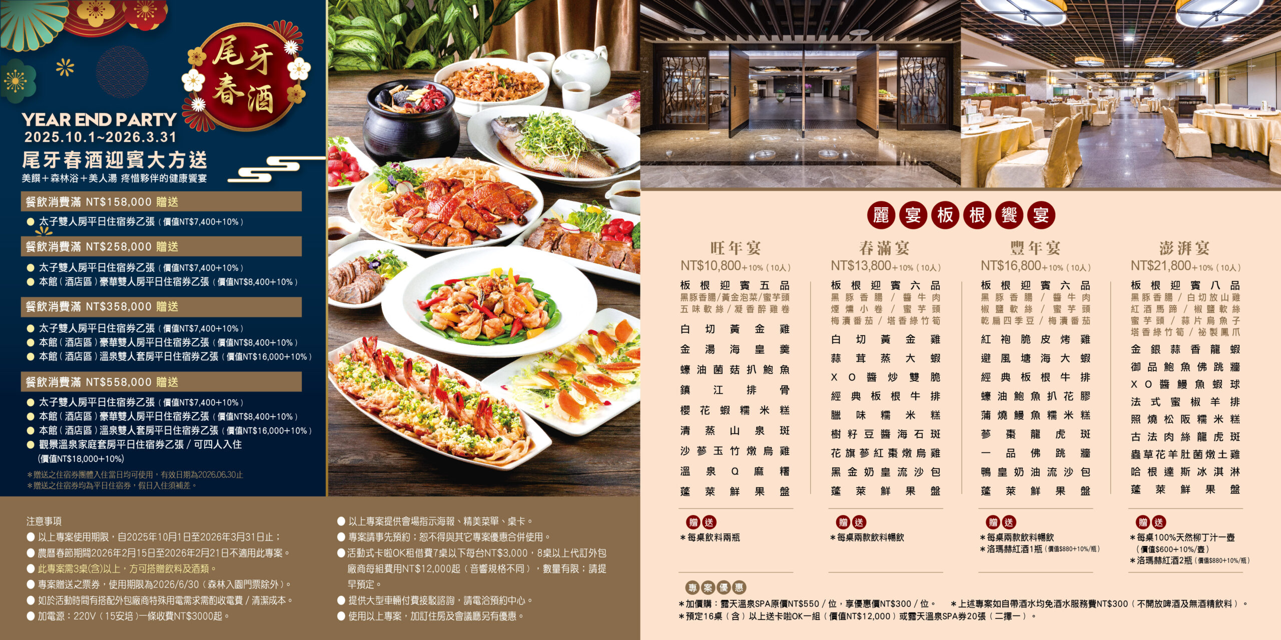 ● 預定 16 桌(含)以上送卡啦OK一組(價值 NT$12,000)或露天溫泉 SPA 券 20 張(優惠二擇一)。