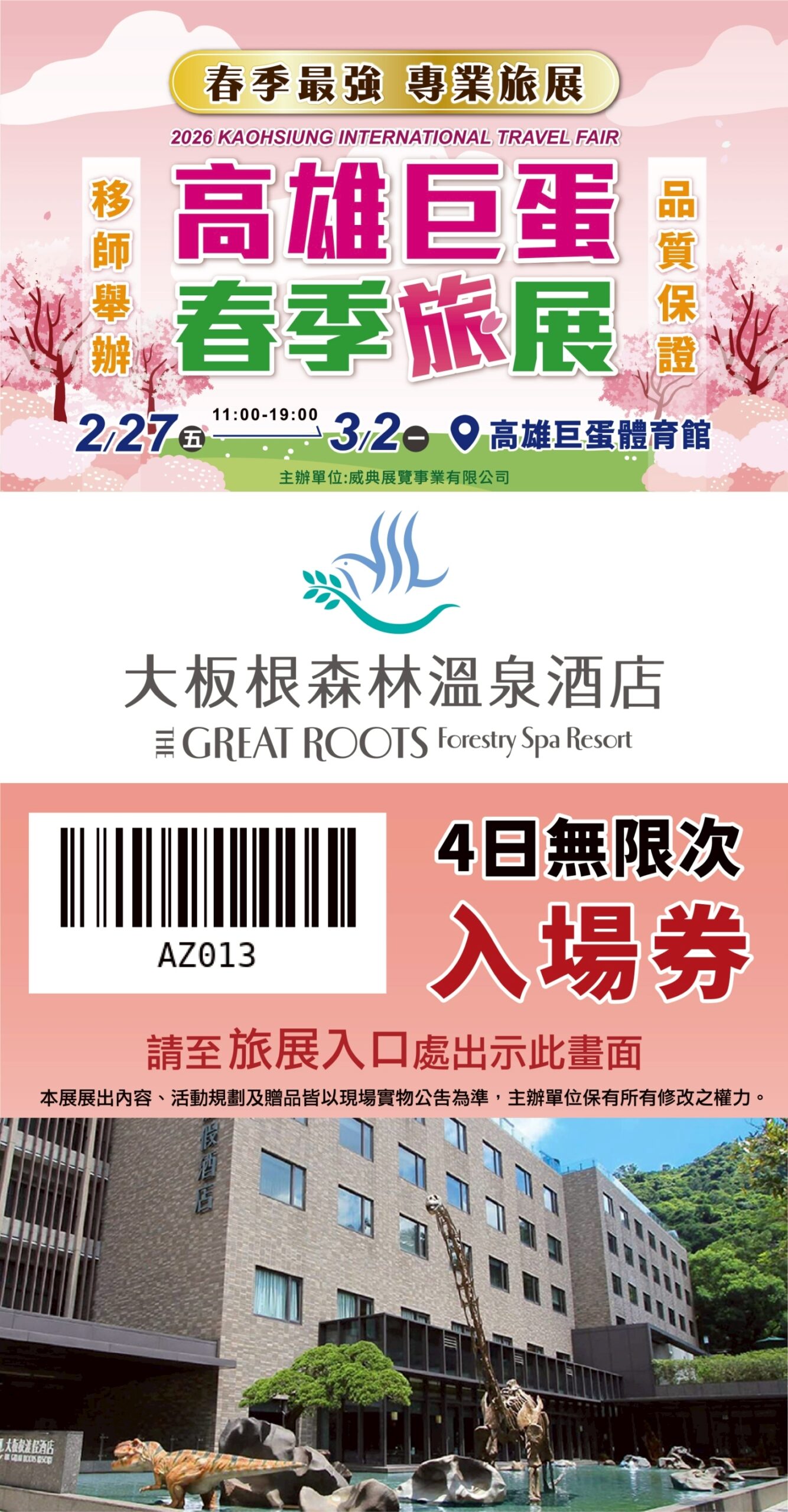 本展無線上旅展,請親至旅展現場購買!高雄巨蛋春季旅展展館免費入場券(點我下載)