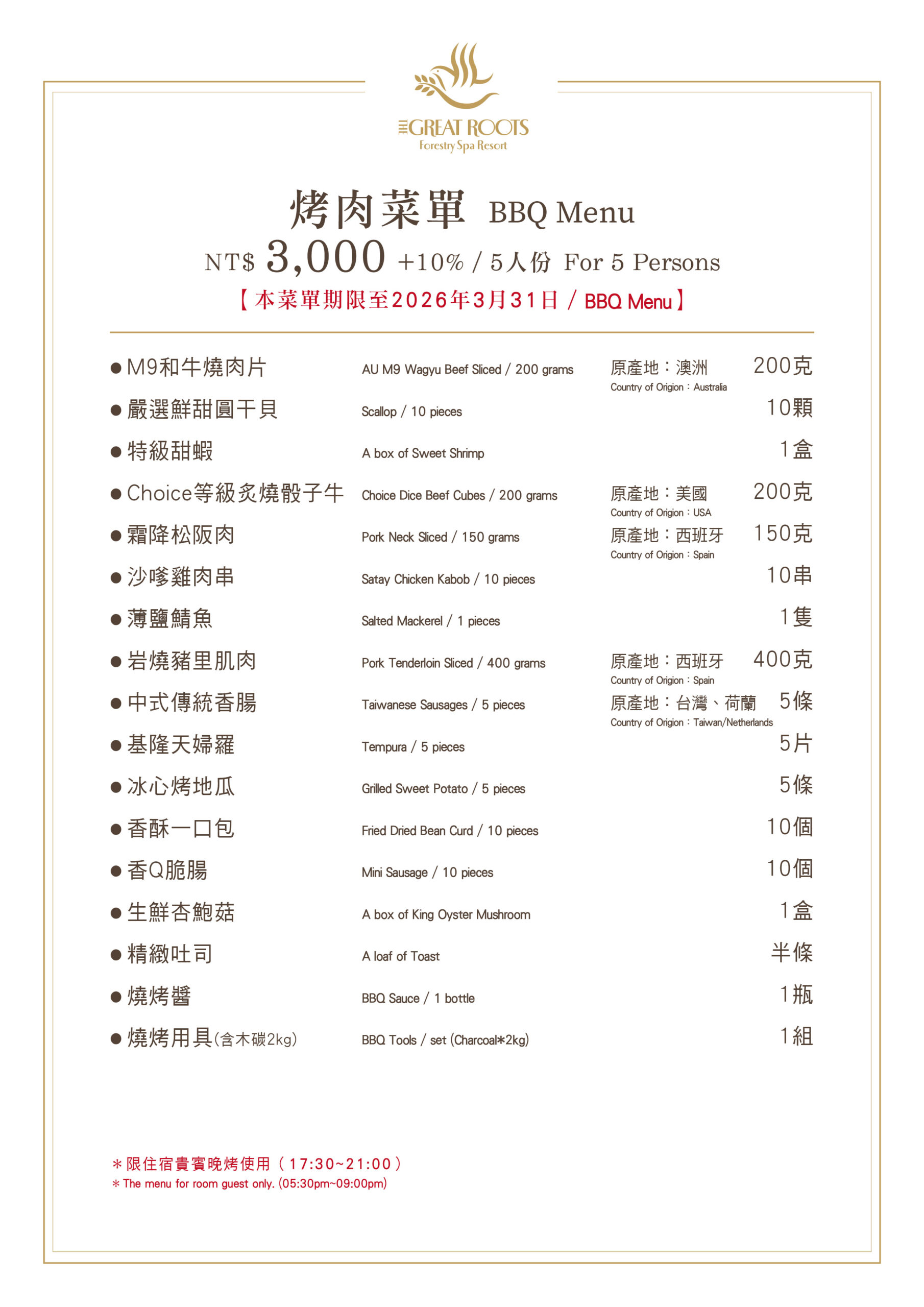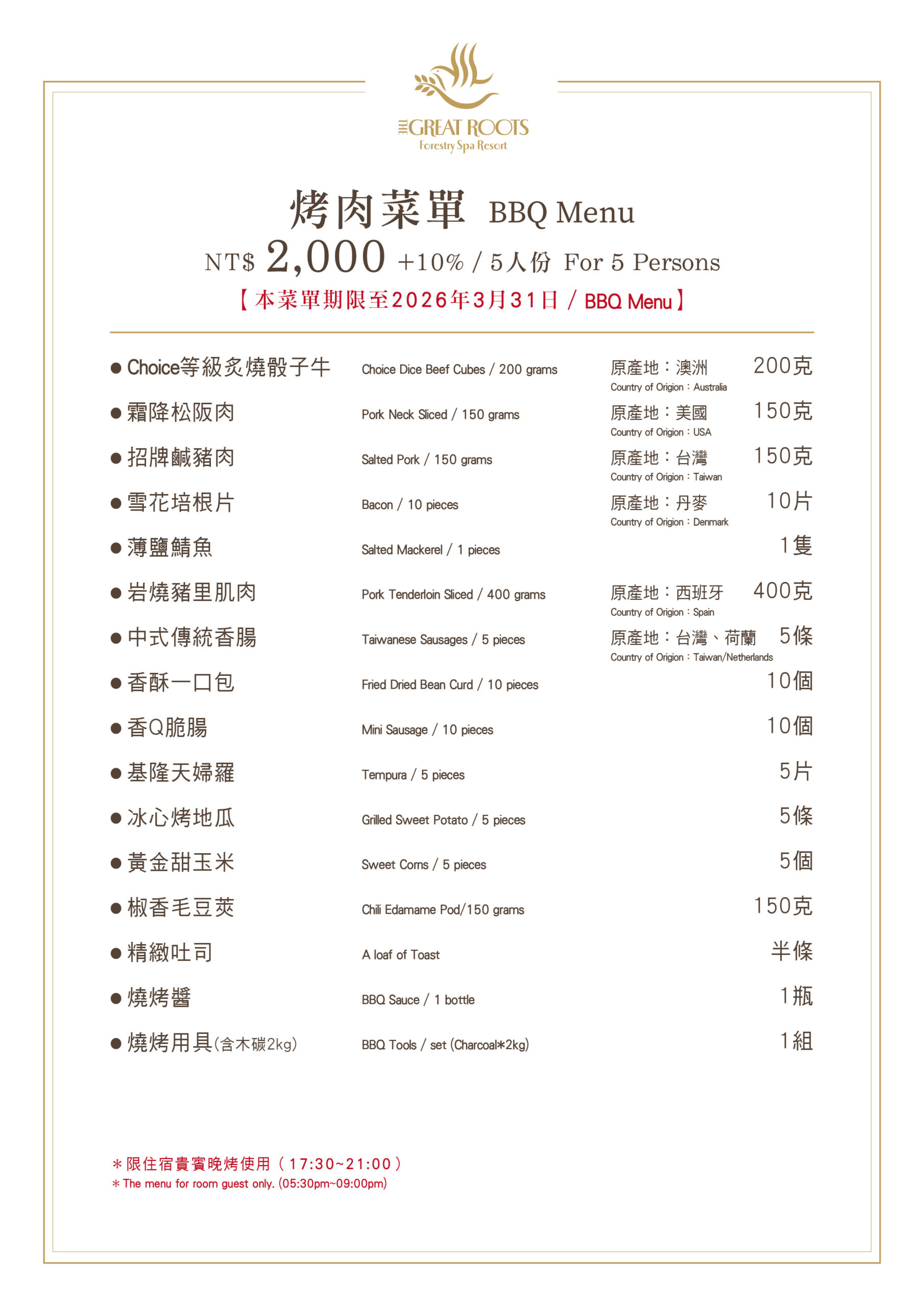 → 晚烤住宿五人份菜單 NT$2,000(連結) & NT$3,000(連結)