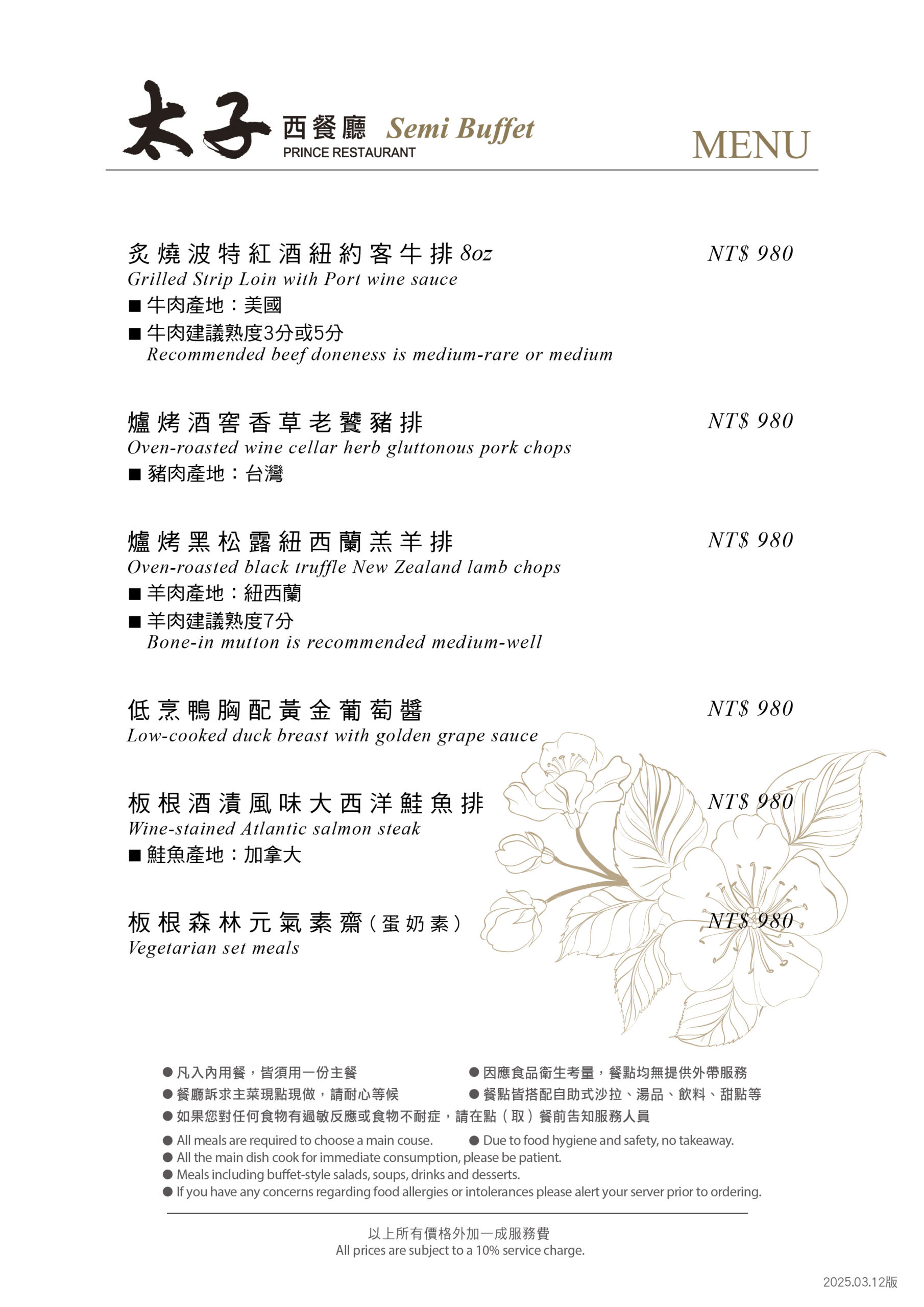 西式︰太子饗宴(平日提供西式套餐 ( 菜單連結 );週五晚餐、週六及週日的午餐與晚餐, 皆供應 Buffet。