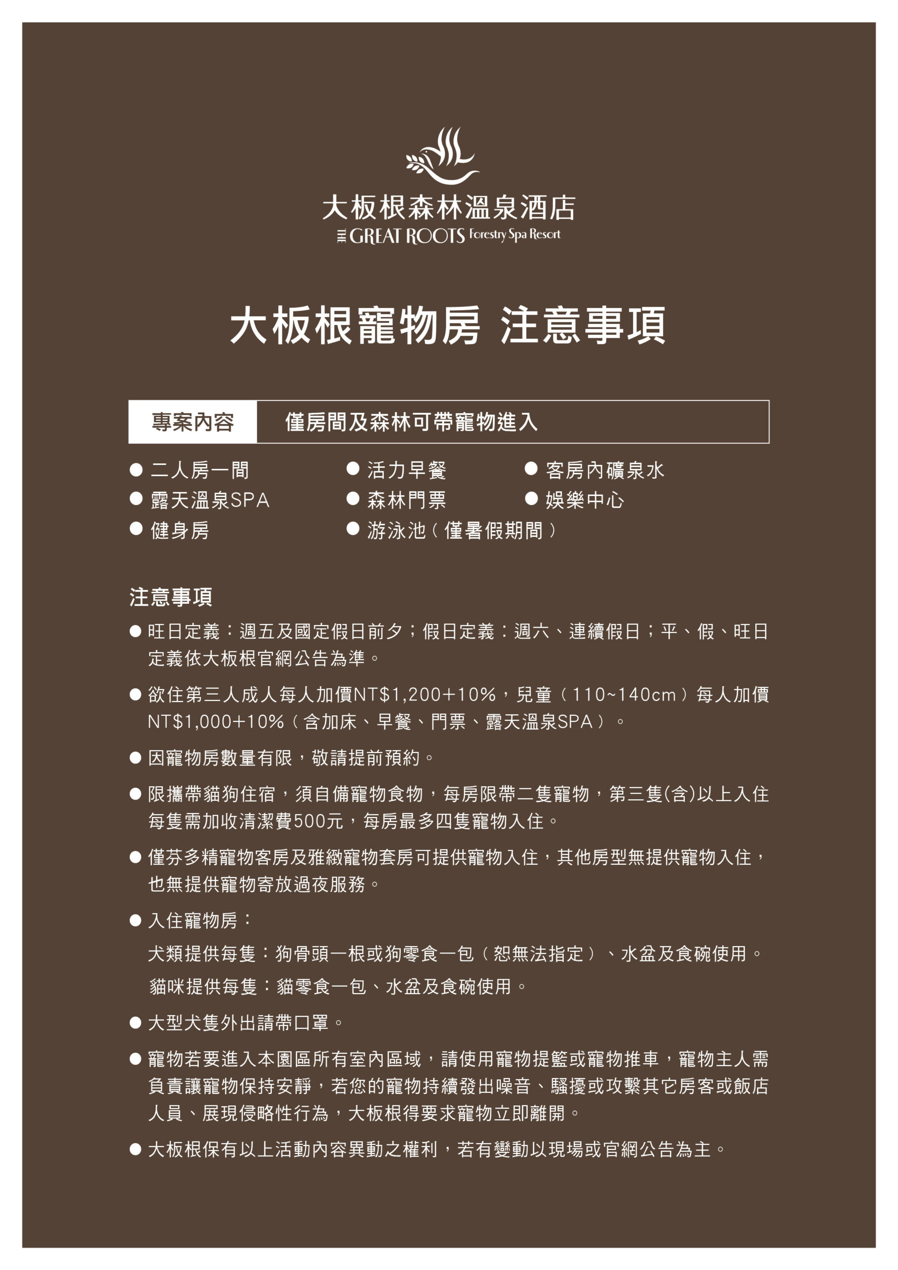 2.大板根平日芬多精寵物四人房+平日力麗哲園月潭寵物四人房住宿券一張 / 只要12499元