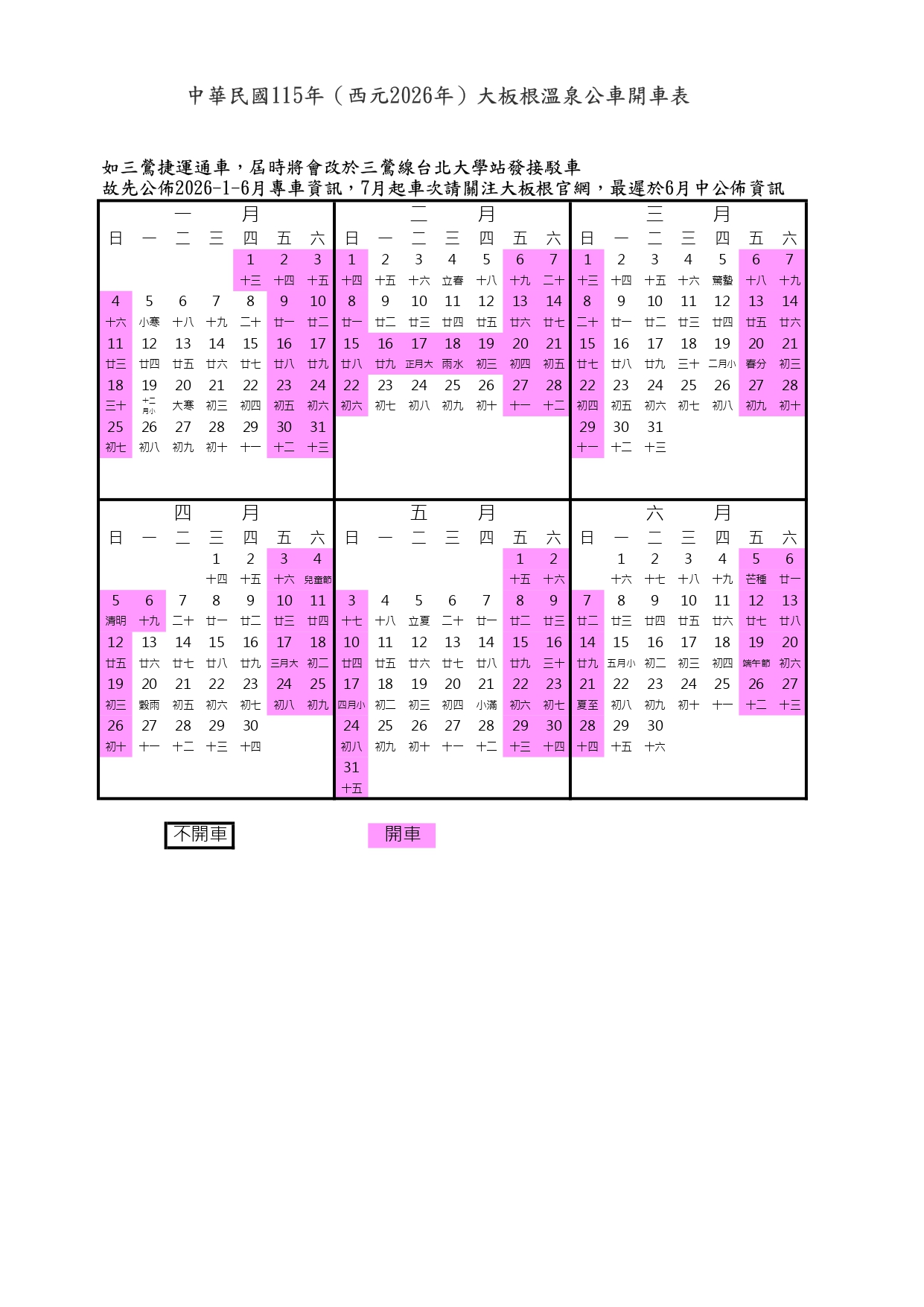 ※大板根站往三峽線到站時間為上述原發車時間再加50 ~60分鐘。